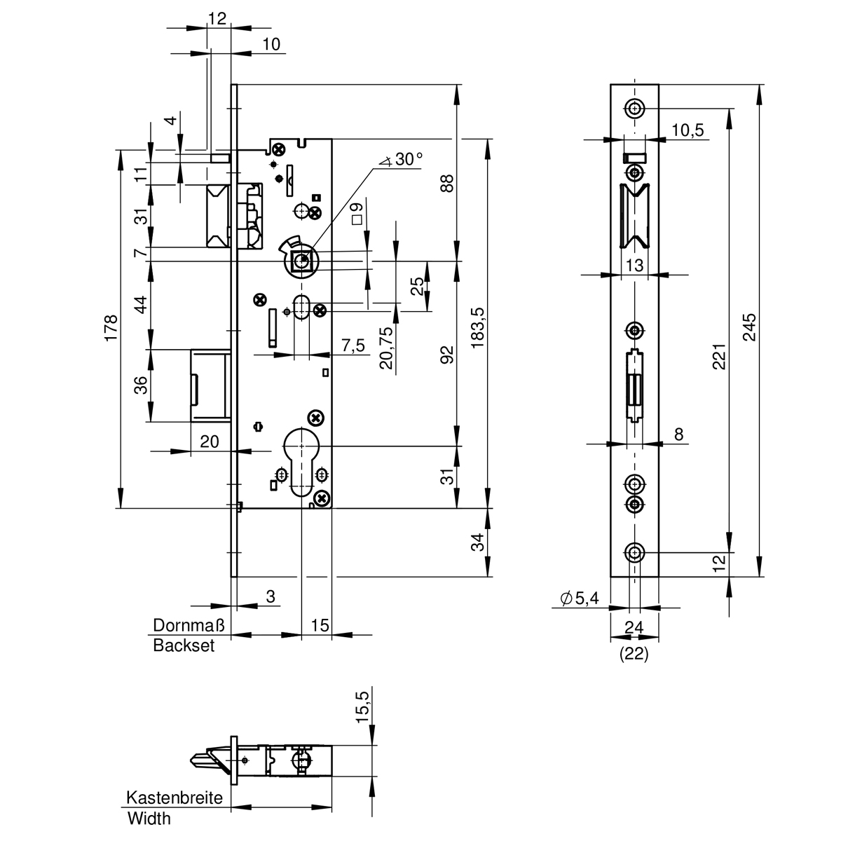 - 3 oder 5 mm vorstehende Falle und Riegel